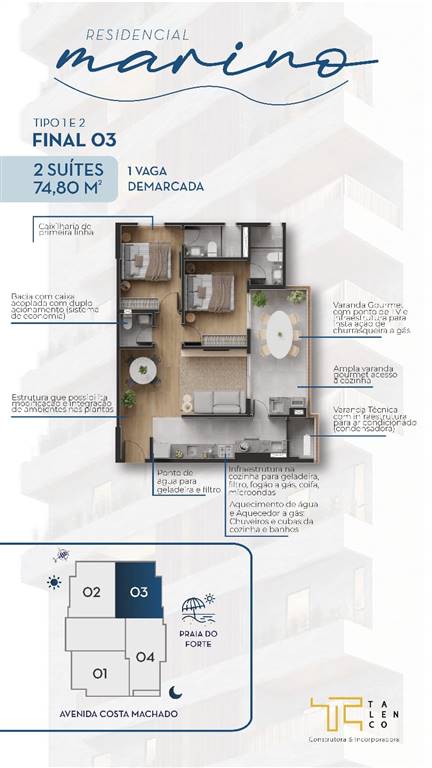 Apto de 2 Dorm c / 2 SUÍTES, garagem PRIVATIVA, 74,83 m² de área útil. CANTO DO FORTE.