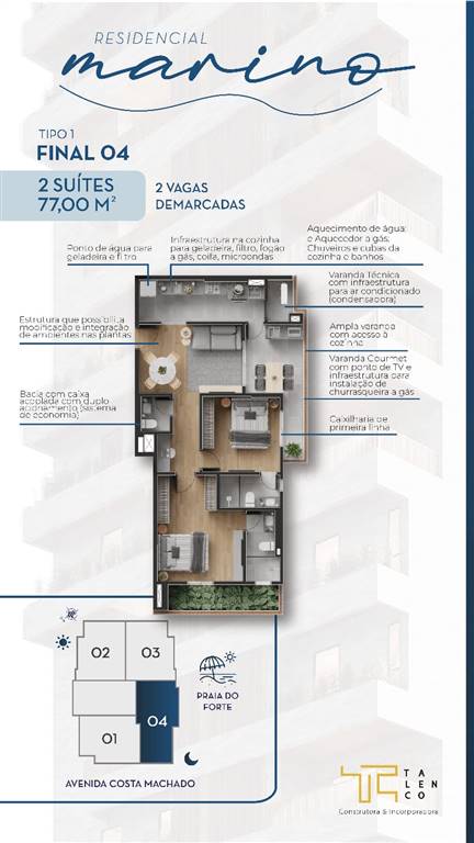 Apto de 2 Dorm, sendo 2 suítes, 2 vagas, SACADA, 77,08 m² de área útil. Bairro: CANTO DO FORTE.
